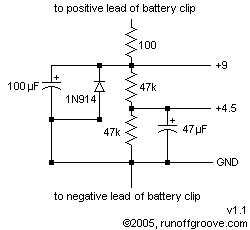 I decided to build an off-board voltage divider with three leads: +9 volts, 4.5 volts, and ground (earth). I also included power supply filtering and reverse polarity protection. This little unit removes 6 components from the breadboard and replaces them with three wires that are much easier to place within a complicated circuit.