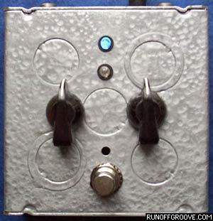 Marshall reponse curve mod The Condor can be modified to reproduce the frequency response of the Marshall speaker simulator that is included on their amps with an XLR output (as traced by Ed Rembold, available at Aron's Selected Schematics). Substitute the following components: Bridged-T notch filter: replace the 1n and 15n caps with 2n2 and 6n8, respectively. High-pass filter: replace the 18k and 100k resistors with 12k and 120k. Low-pass filters: replace the 3n9 caps with 4n7, and replace the four 22k resistors with 15k or 18k (16k is the nominal value, if you can get it; otherwise use 15k for slight extra treble, or 18k for some less fizz). The below graph compares the original Condor frequency response with the Marshall mods. Notch Depth Switch mod While the above modifications will accurately reproduce the Marshall speaker simulator's response curve, so many components differ from the stock Condor that using a switch to toggle between the two is not feasible. However, a compromise is available if we focus our efforts on the Marshall notch depth. By adding and removing capacitors in parallel with the notch caps, we can produce a notch depth that approximates the notch produced by the Marshall speaker simulator. Best of all, a DPDT switch can be used to toggle between the two modes - or a 3PDT can be used to allow LED indicators for each response. As shown in the partial schematic below, the 1n "bridge" cap is unchanged while the stock 15n cap is changed to a 6n8. A 1n2 and 8n2, both with a single-pole switch in series, are placed in parallel with those caps, respectively. By using a DPDT switch for the two single-pole switches, we can open a switch while closing the other. When the 1n2 "bridge" cap switch is open and the 8n2 switch is closed. The 6n8 and 8n2 caps are in parallel, which creates a total capacitance of 15n. Those values produce a notch as found in the stock Condor. As the DPDT switch is activated, the 1n2 cap is added in parallel with the 1n, forming a 2n2 cap. Simultaneously, the 8n2 cap is switched out, leaving just the 6n8 cap to ground. The notch depth is now roughly half of the stock circuit, which is close to the Marshall response. In addition to the added midrange content produced by the decreased notch depth, more treble frequencies are present and the overall output is increased. Remember, this modification does not reproduce the Marshall response, but is a good "halfway point" that adds to the usefulness of the stock Condor. Refer to the below schematic for the necessary modifications. A 3PDT switch wiring diagram is also shown, but you can ignore the middle column and use a DPDT if you don't want LED indicators. The Notch Depth Switch mod was implemented in the official runoffgroove.com Condor build, shown below. The blue LED indicates that the stock notch is active, while an amber LED is used to indicate the Marshall notch. |