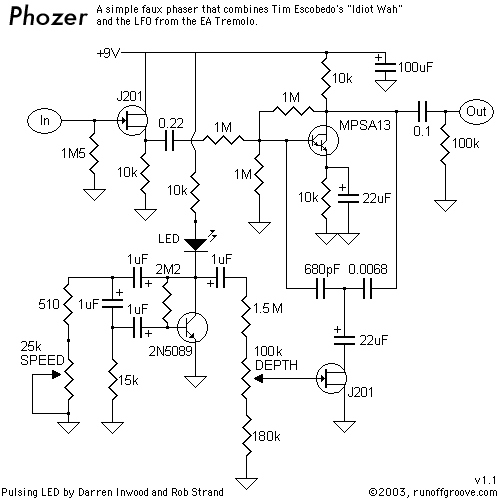 The original Phozer was a sound idea, but was hindered by its mashed-up development. The circuit didn't really exceed the sum of its parts, namely Tim Escobedo's Idiot Wah and the LFO from the EA Tremolo. The faux phase shifting effect was reasonably convincing at faster speeds, but the LFO failed to produce a true sweep at slower speeds. Rather than ramp up and down, at slow speeds the LFO simply spent more time in the darker heel-down position between quick pulses of toe-down mode. Also, we saw that using op-amps rather than discrete components would probably allow for a more complex effect with fewer parts.